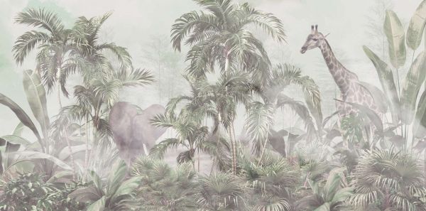 Dans cette scène enchantée, les silhouettes gracieuses d'une girafe et d'un éléphant sont encadrées par le vert luxuriant d'une forêt tropicale brumeuse. Les palettes de couleurs subtiles renforcent la sensation d'une aube paisible sur la savane.