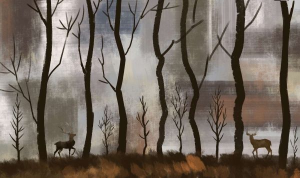 Dans un monde de formes abstraites et de transitions de couleurs douces, un cerf se tient paisiblement parmi les arbres dénudés. L'arrière-plan diffus suggère un matin brumeux ou un crépuscule silencieux, où le monde naturel se repose et salue ou clôt la journée.