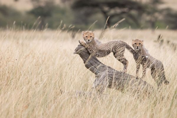 Des petits guépards curieux, perchés sur un tronc d'arbre, observent la zone.