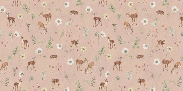 Un motif forestier délicat avec des cerfs gracieux et des fleurs subtiles dans des couleurs pastel douces. Ce design ludique dégage une atmosphère douce et naturelle, parfaite pour ajouter une touche douce et charmante à n'importe quel espace.