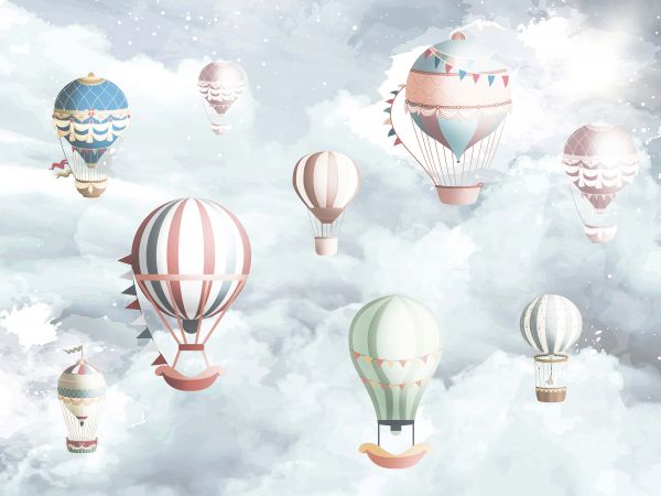 Des montgolfières colorées avec des drapeaux dans les nuages bleus.