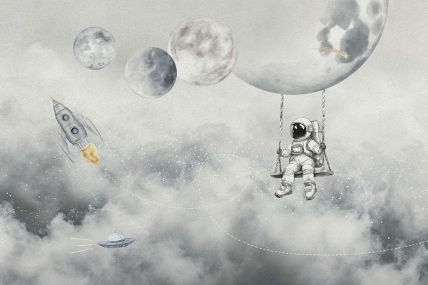 Cette illustration montre une scène vivante avec des vaisseaux spatiaux qui tracent des trajectoires gracieuses autour de planètes dessinées en détail, le tout baigné dans une lumière douce et brumeuse. C'est un mélange ludique de fantaisie et de réalisme, capturé dans une palette de couleurs atténuées.