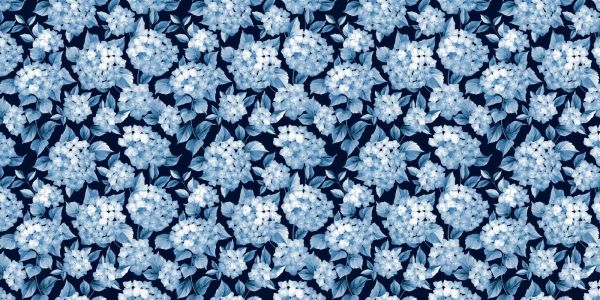 Ce design présente une collection de fleurs d'hortensia, illustrées dans différentes nuances de bleu, qui contrastent élégamment avec un fond bleu nuit profond. Les fleurs sont stylisées avec un jeu d'ombres délicat, créant une profondeur qui fait presque jaillir les bourgeons de la toile.