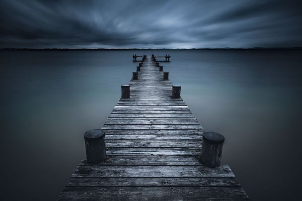 Un appontement photographié par un jour nuageux. Les côtés de la photo sont sombres, de sorte que l'appontement se démarque bien.