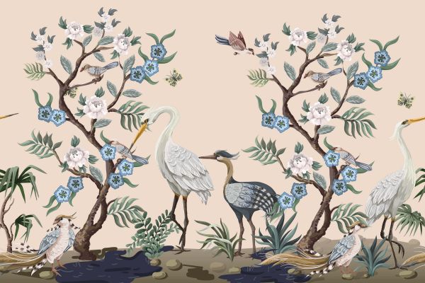 Des hérons colorés près des arbres en fleurs. Combinez ce papier peint dans la chambre de vos enfants et créez une atmosphère joyeuse.