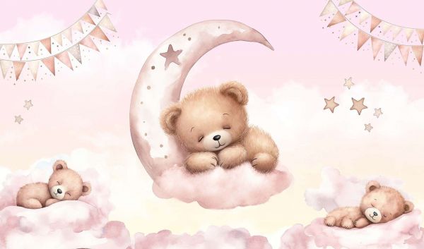 De tendres ours en peluche rêvent paisiblement sur de douces nuages roses, tandis qu'un câlin repose sur une lune gracieuse. Les couleurs pastel, les étoiles scintillantes et les drapeaux ludiques créent une atmosphère rêveuse et apaisante.