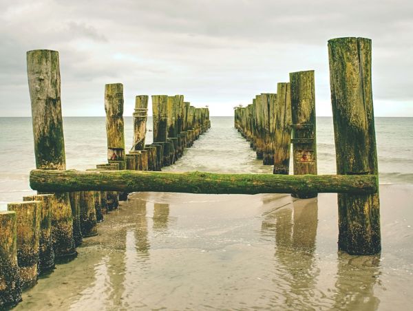 Des têtes de pieux moussues dans l'eau en différents matériaux