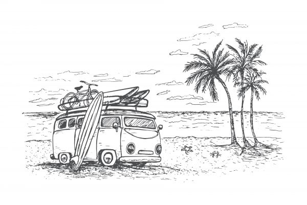 Ce design présente un dessin en noir et blanc d'un van vintage garé sur une plage, symbolisant l'esprit d'aventure et de liberté. Le van est chargé de planches de surf et d'un vélo sur le toit, prêt pour une journée de fun et d'exploration. À côté du van, des palmiers majestueux se dressent, ajoutant une touche tropicale et relaxante à la scène. La mer en arrière-plan complète ce tableau idyllique, invitant à la détente et à l'évasion.