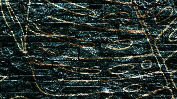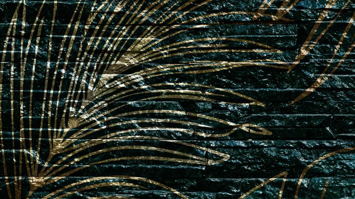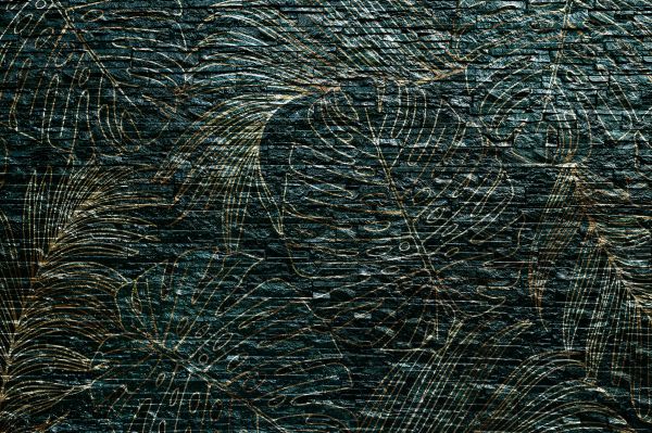 Un mur de pierre ponctué de feuilles vertes dorées. Combinez ce papier peint dans votre maison et créez encore plus d'atmosphère.
