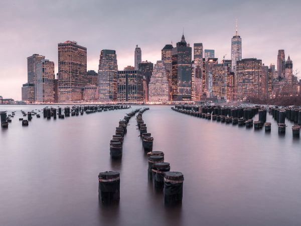 Digues près de Manhattan sur papier peint. Cette photo a été prise en début de soirée, les lumières des bâtiments sont déjà bien visibles.