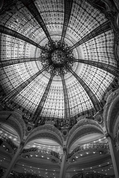 Un impressionnant dôme de verre orné de motifs élégants et de lignes symétriques. Le contraste noir et blanc met en valeur la grandeur et la finesse architecturale de l'édifice.