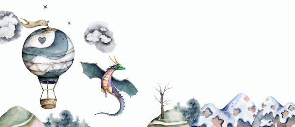 Un monde magique en aquarelle avec un dragon volant, une montgolfière et une forêt vallonnée.