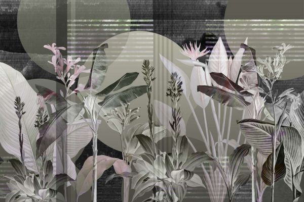 Une combinaison harmonieuse de feuilles tropicales et de formes géométriques abstraites dans des tons sourds. Ce design dégage une atmosphère moderne et apaisante, parfaite pour un intérieur serein et contemporain.