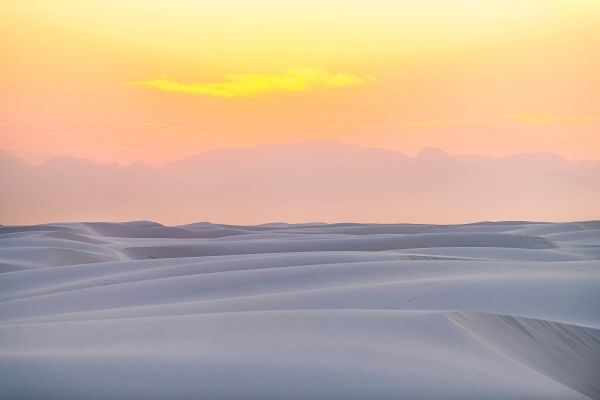 Les dunes de sable blanc du monument du parc national du Nouveau-Mexique. Le coucher de soleil permet de voir la silhouette des montagnes.