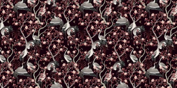 Dans un arrière-plan riche et sombre, une danse élégante de grues se déploie au milieu de fleurs en fleurs. La posture gracieuse des oiseaux et le rose délicat des fleurs créent un motif classique et intemporel qui dégage à la fois calme et mouvement.