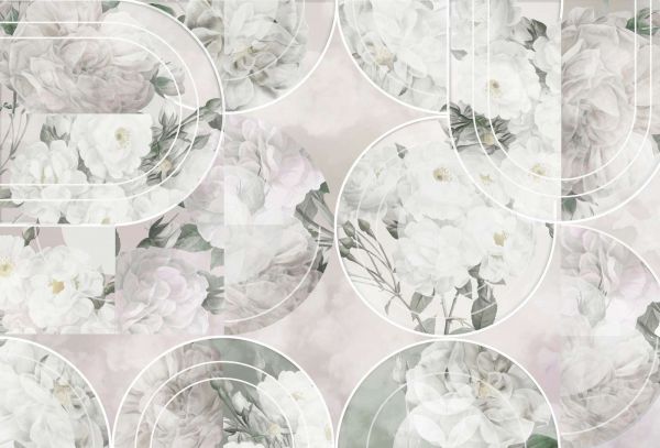 Ce design combine la beauté romantique des grandes roses avec un cadre géométrique moderne. Les délicates teintes roses et blanches des fleurs sont parfaitement complétées par un fond subtil de nuances vertes et beiges. Cette combinaison crée une atmosphère apaisante qui dégage à la fois raffinement et chaleur.