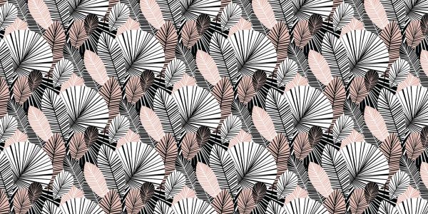 Motif de différentes feuilles dans les couleurs noir, blanc et rose tendre.