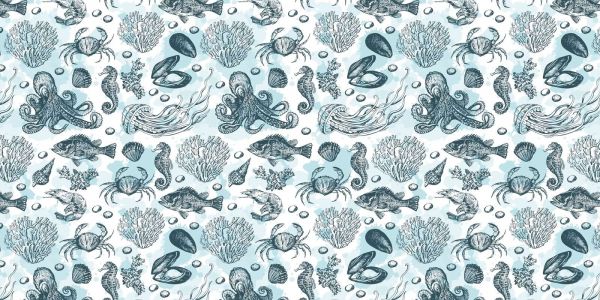 Une image aquatique de la vie marine, des crabes aux poulpes, est unifiée dans une palette bleue cohérente. Ce motif répétitif capture l'essence de l'océan dans un design stylisé et intemporel.