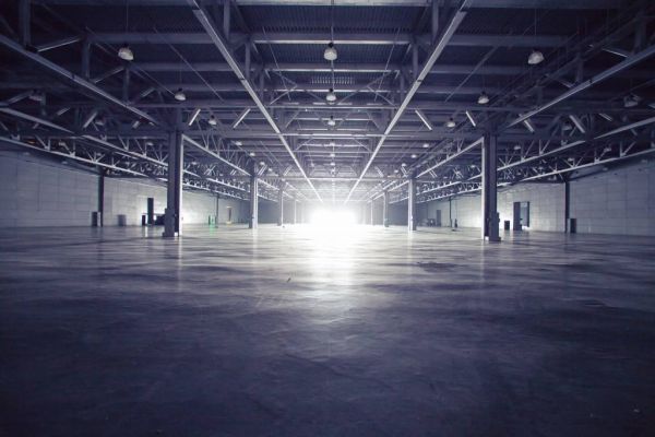 Papier peint avec un entrepôt sombre et une ouverture éclairée à l'extrémité