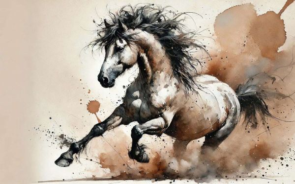 Un portrait expressif à l'aquarelle d'un cheval galopant puissamment, entouré de poussière soulevée. Les tons terreux et les coups de pinceau dynamiques soulignent l'énergie et l'élégance de l'animal, tandis que les éclaboussures et les traits ajoutent mouvement et vie.