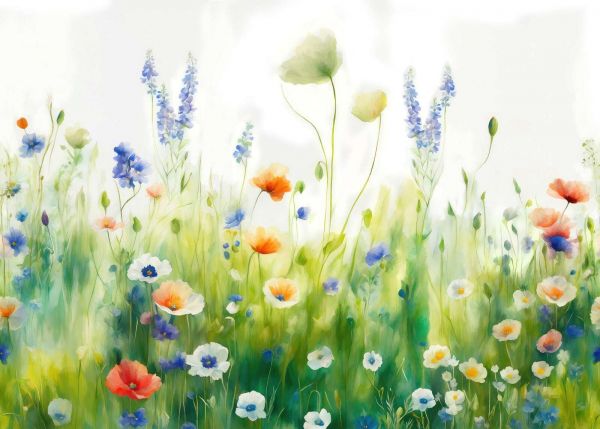 Ce design est idéal pour les chambres, les salons ou une véranda lumineuse, où il crée un sentiment d'ouverture et de sérénité. Le style aquarelle doux et l'utilisation harmonieuse des couleurs font que ce champ de fleurs donne sans effort une apparence intemporelle et élégante à chaque espace.