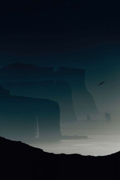 Cette image respire le mystère et la sérénité. Plusieurs falaises massives se dessinent dans une perspective stratifiée, chacune subtilement estompée par un épais brouillard bleu-gris. Les tons de couleur sont profonds, discrets et presque monochromes : des variations de bleu nuit, de gris acier et de vert océan frais dominent la composition. Au loin, un oiseau glisse dans les airs, un petit mais puissant élément qui apporte du mouvement dans ce monde autrement figé.