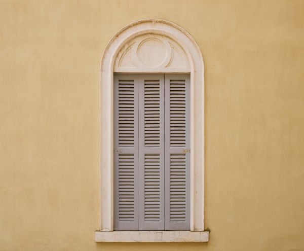 Fenêtre avec volets en bois sur un mur jaune