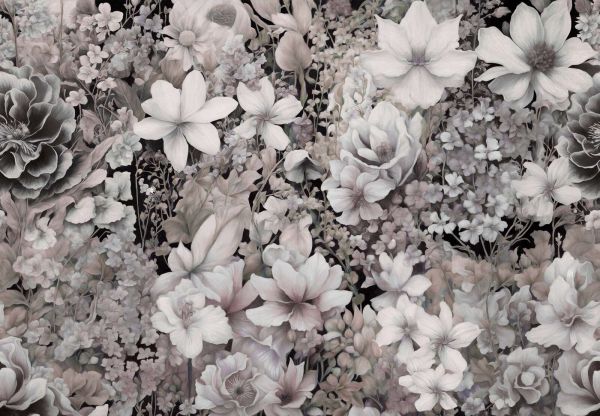 Un décor floral chaleureux avec des fleurs blanches et crème, alternées avec des accents subtils dorés et bruns. La douce tonalité terreuse crée une ambiance cocooning et confortable. Les détails organiques des feuilles renforcent l'aspect naturel.