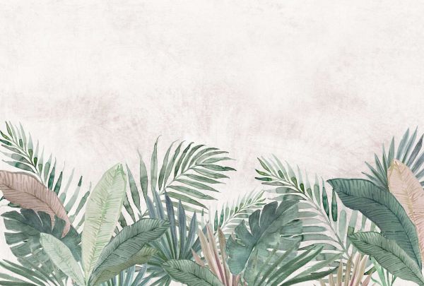 Une collection luxuriante de feuilles tropicales dans des tons aquarelle doux tels que le vert jade, l'olive, le beige et le rose poudré décore le bas d'un fond léger et subtilement texturé. Frais, aéré et botaniquement raffiné.