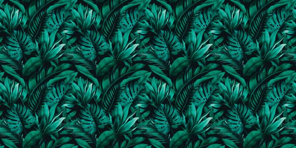 Motif tropical avec monstera exotique, banane et feuilles de palmier sur fond sombre.
