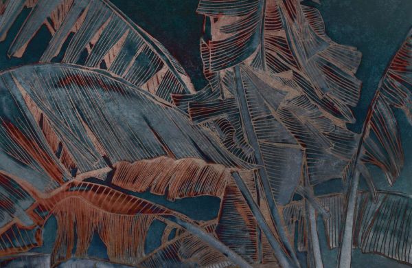 Un jeu de lignes abstrait de grandes feuilles de bananier dans des teintes bleu-vert profond et brun rouille cuivré. Stratifié et puissant avec une apparence luxueuse et tropicale.