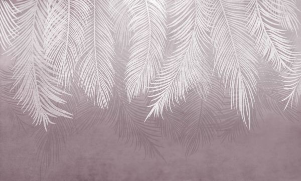 Feuilles de palmier blanches suspendues sur un fond violet clair sur une structure en béton.