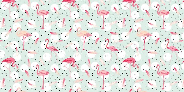 Papier peint avec un motif de flamants roses et de plumes sur fond vert menthe à pois blancs et noirs.