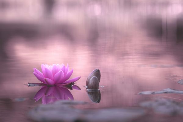 Fleur de lotus rose dans un étang calme avec une lueur rose