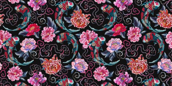Fleurs asiatiques et carpes en cage sur Papier peint photo. Combinez ce joyeux papier peint dans votre salon ou votre chambre pour encore plus d'ambiance.