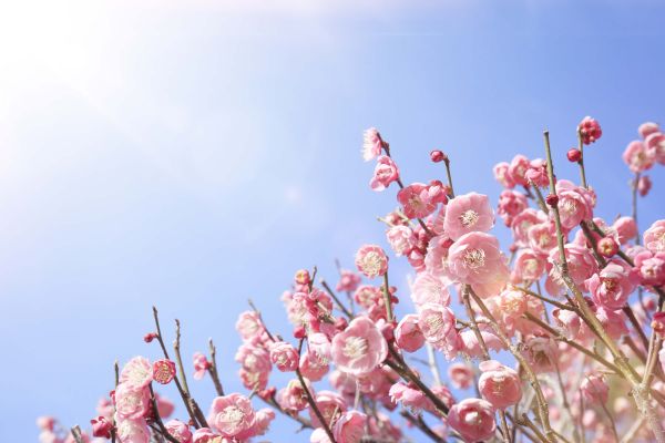 Une belle image de fleurs roses avec un ciel bleu et des rayons de soleil.