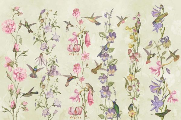 Des fleurs en teintes douces de rose, violet et jaune s'enroulent gracieusement contre un fond vert-gris subtil. Des colibris aux plumes irisées voltigent joyeusement entre les fleurs, créant une atmosphère romantique et rêveuse. La combinaison de détails botaniques et d'oiseaux exotiques donne un ensemble élégant et raffiné.