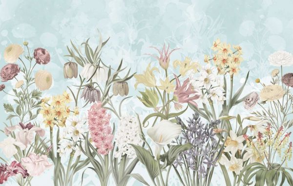 Papier Peint Panoramique Fleurs de printemps - Aqua brumeux