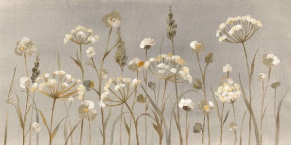 Fleurs des champs délicatement peintes dans des tons chauds de beige, crème et ocre doux sur un fond gris-beige calme. La composition dégage une sensation de tranquillité, avec des lignes naturelles et des formes florales aériennes qui évoquent une atmosphère estivale douce.