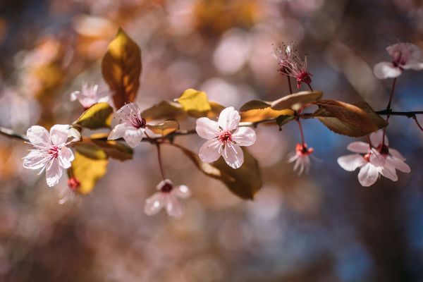 Une image en gros plan d'une branche de fleur rose avec des feuilles brunes.