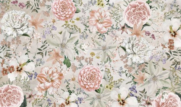 Ce design combine la beauté des fleurs classiques avec un look raffiné et doux. De grandes fleurs élégantes telles que des pivoines et des roses alternent avec des fleurs et des feuilles plus petites, placées sur un fond neutre qui rayonne de paix et d'équilibre. Les couleurs sont subtiles et harmonieuses, avec des nuances de crème, de rose tendre, de beige et de vert.