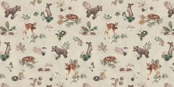 Un motif forestier enchanteur avec des animaux espiègles tels que des cerfs, des ours et des lapins, entouré de feuilles, de champignons et d'autres détails forestiers. Ce design délicat sur un fond apaisant apporte la magie de la forêt à l'intérieur, idéal pour créer une atmosphère sereine et naturelle dans n'importe quel espace.