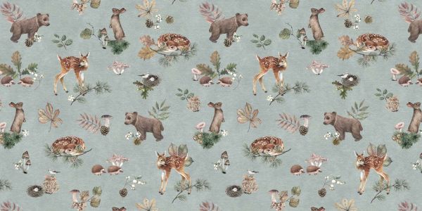 Un motif forestier enchanteur avec des animaux espiègles tels que des cerfs, des ours et des lapins, entouré de feuilles, de champignons et d'autres détails forestiers. Ce design délicat sur un fond apaisant apporte la magie de la forêt à l'intérieur, idéal pour créer une atmosphère sereine et naturelle dans n'importe quel espace.