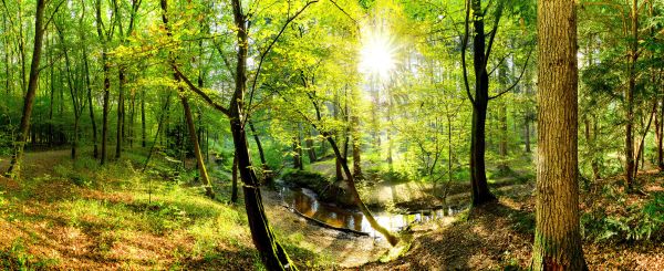 Un endroit ouvert dans la forêt avec un ruisseau et un soleil radieux.