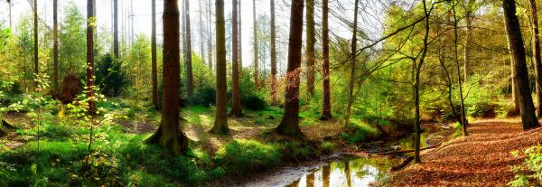 Panorama d'une forêt d'automne avec la lumière du soleil qui brille à travers les arbres.