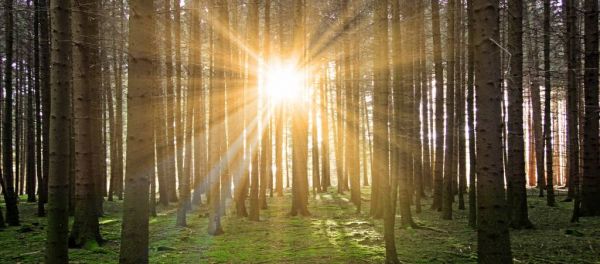 Papier peint avec une photo panoramique d'une pinède avec des rayons de soleil
