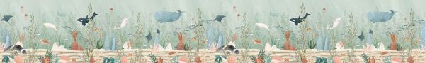 Cette illustration sous-marine ludique présente un monde marin vivant, peuplé d'animaux et de végétation colorée. Des orques, des baleines, des dauphins et des mammifères marins blancs nagent entre des algues qui ondulent, des bancs de poissons et des méduses qui flottent avec élégance. Sur le fond sablonneux du fond marin reposent des coquillages, du corail et des plantes marines dans des tons de rose pâle, de terracotta, de bleu-gris et de vert menthe. L'atmosphère est rêveuse, amicale et accueillante.