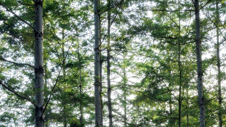 Forêt détaillée avec de grands arbres minces au lever du soleil