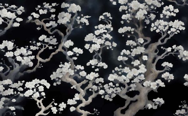 Des fleurs blanches serpentent gracieusement sur des branches sombres et brumeuses, semblant s'illuminer sur un fond noir profond. L'effet subtil du pinceau donne à l'ensemble une allure rêveuse, presque mystique.