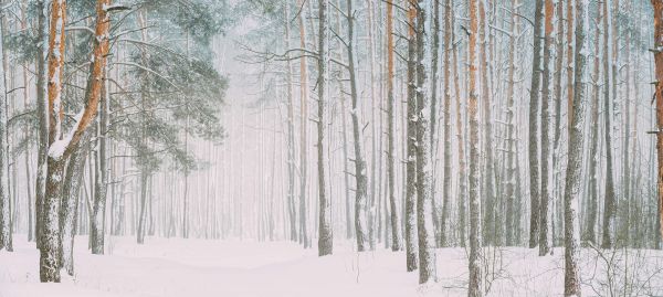 Une belle image d'une forêt couverte de neige.